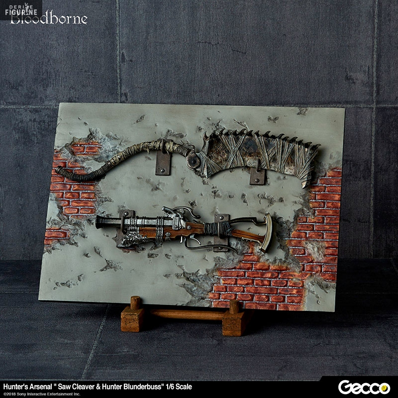 Ce pack vous permet de mettre les mains sur deux armes mythiques du célèbre jeu vidéo Bloodborne et de son extension The Old Hunters. Vous avez droit au couperet-scie ainsi qu’au tromblon pour votre chasseur. Effectivement, il est possible d’équiper ses deux armes à l’article 59968 disponible sur le site. Il s’agit de la somptueuse figurine du chasseur. Pour celles et ceux souhaitant opter seulement pour ces armes légendaires, le pack d’armes propose un présentoir permettant d’exposer seulement les deux armes ensembles.