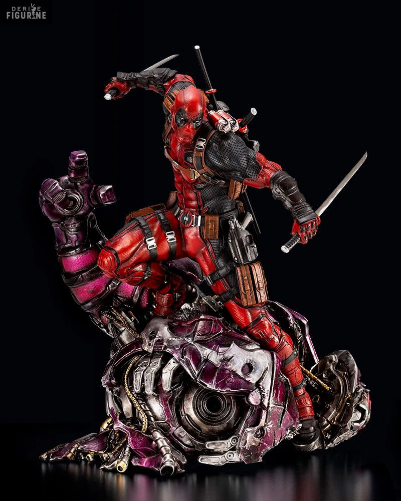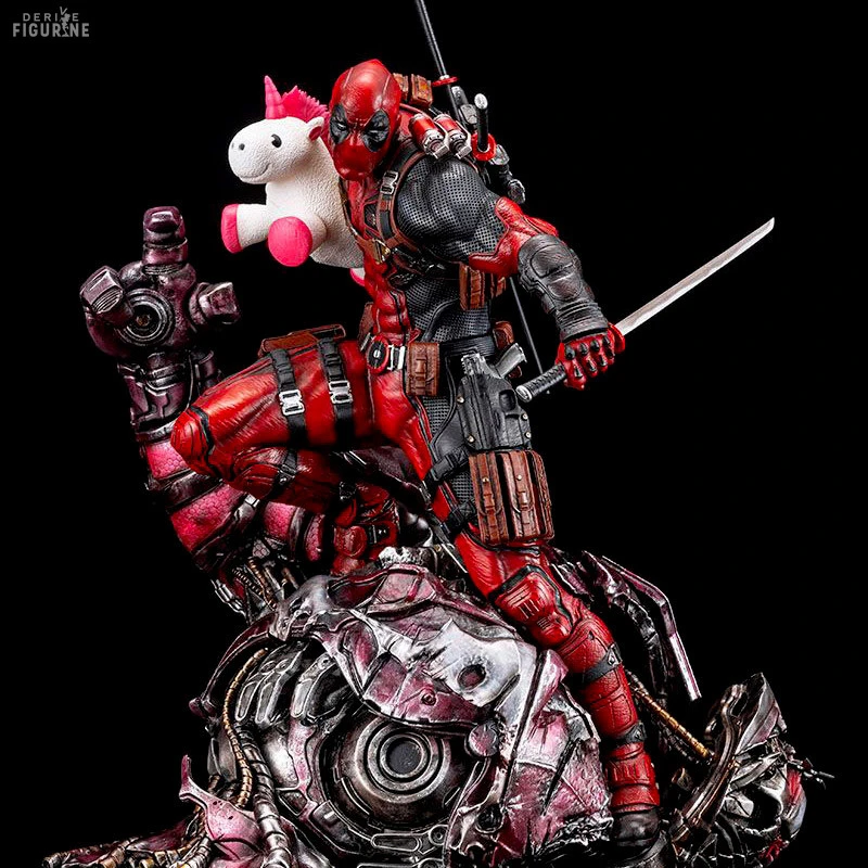 Deadpool est un peu ce que l’on appelle un anti-héros. Wade Wilson n’a pas grand chose a perdre puisqu’on lui a découvert une maladie grave et incurable et c’est pour cela qu’il a accepté d’être le cobaye pour le projet Arme X. Depuis, il a une capacité de régénération hors du commun et vous pouvez ici le voir dans sa tenue rouge et noire, en train d’anéantir un Sentinel. Vous pourrez l’exposer avec deux katanas, une arme à feu ou… une licorne !! dans la main droite. Il possède également un visage avec son design actuel, mais aussi un des années 90. Enfin, il s’agit d’une figurine en édition limitée.