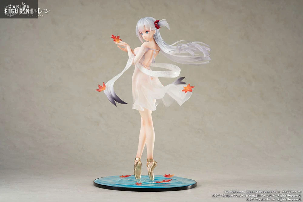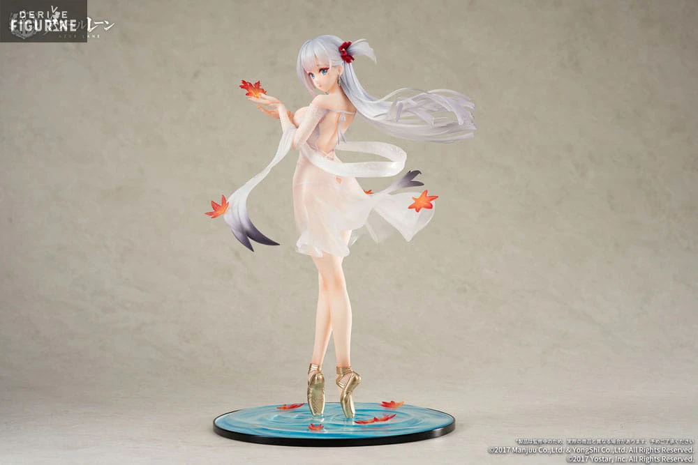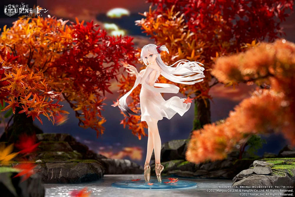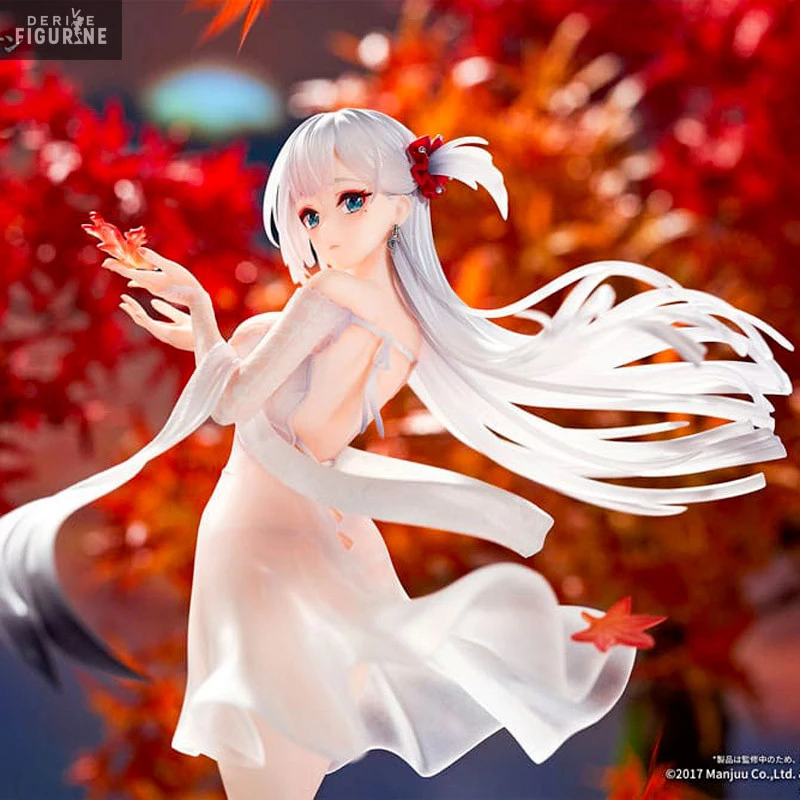 Le Shokaku est un porte-avions pouvant transporter plus de 90 avions de la marine impériale japonaise. Il a participé à de nombreuses guerres importantes de l’histoire comme celle de Pacifique ou la Seconde Guerre mondiale, avant de couler dans la mer des Philippines. Ici, vous pouvez admirer la version de Azur Lane qui est donc une femme à la chevelure blanche qui porte des chaussons de danseuse étoile, faisant des pointes. On peut voir que le vent fait voler des feuilles d’érables autour d’elle, emportant sa robe et ses cheveux par la même occasion.