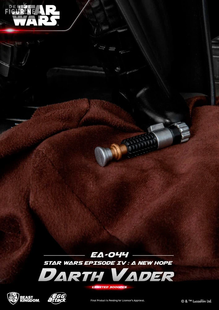 Cette incroyable figurine de la collection des Egg Attack vient de l’épisode IV de Star Wars et représente Dark Vador. Le seigneur Sith est ici présenté sur un socle décor, sabre laser en main et il dispose d’options lumineuses mais aussi sonores. Cela concerne son sabre et son corps pour ce qui est des effets lumières. On peut aussi remarquer ce qu’il reste d’Obi-Wan Kenobi qui vient de mourir, ou plutôt, de ne faire qu’un avec la force comme s’il devait un simple esprit qui pourra guider Luke…