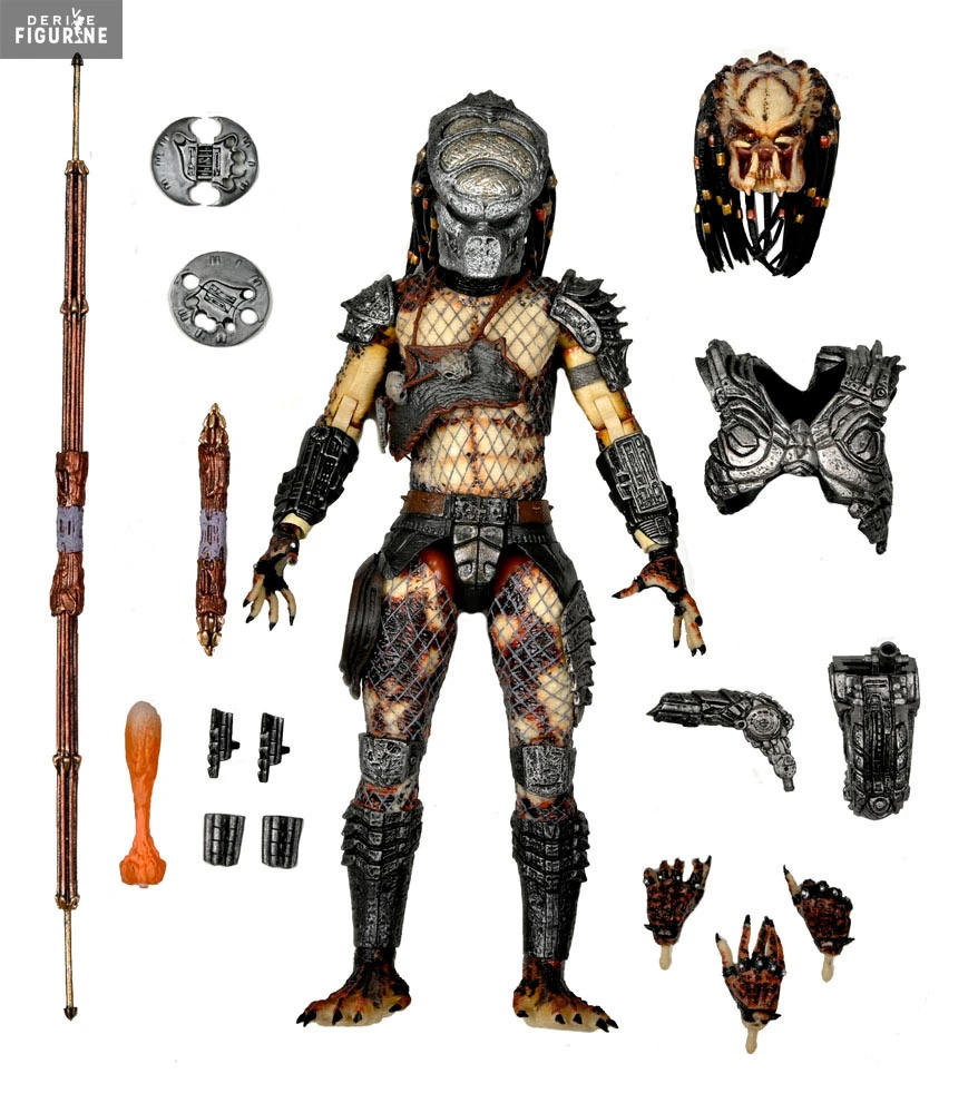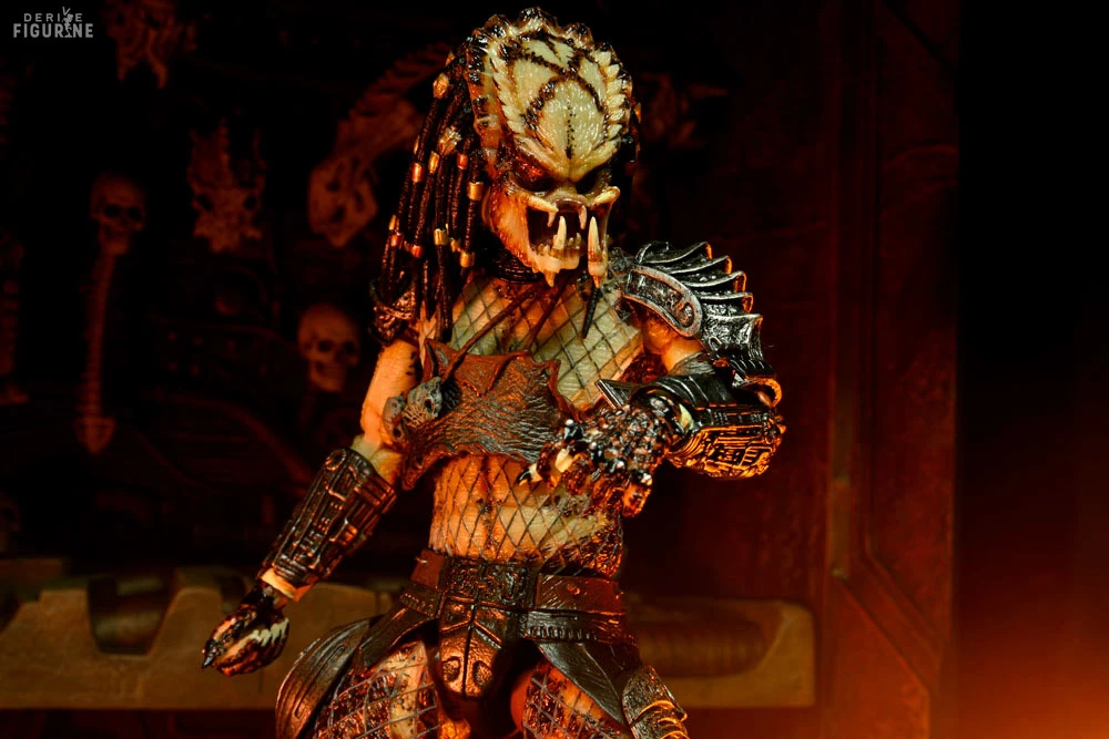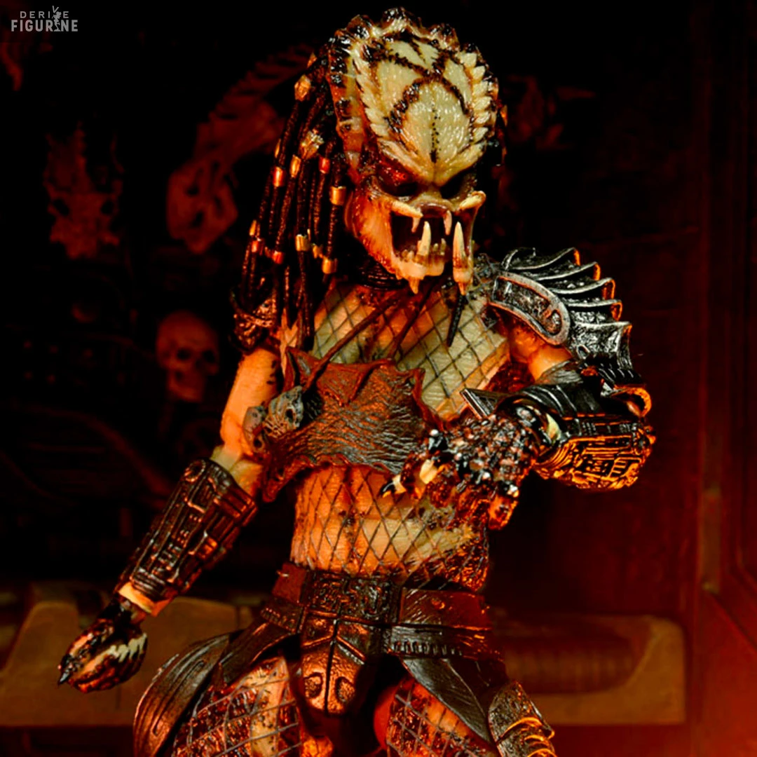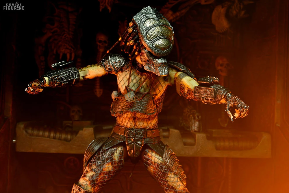 Boar fait partie d’une espèce de Yautja assez rare, car la quasi totalité des siens ont été anéantis par un rival. Il est le seul avec son frère à avoir survécu. Comme souvent avec les figurines de NECA, vous pouvez l’exposer de nombreuses façon car il possède des parties interchangeables dont un visage avec et un sans masque, des armes et armures.