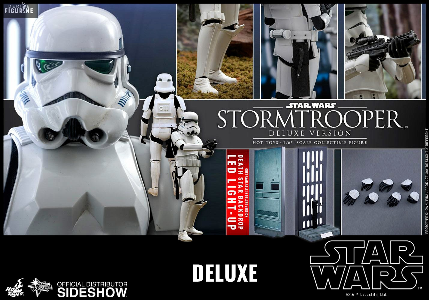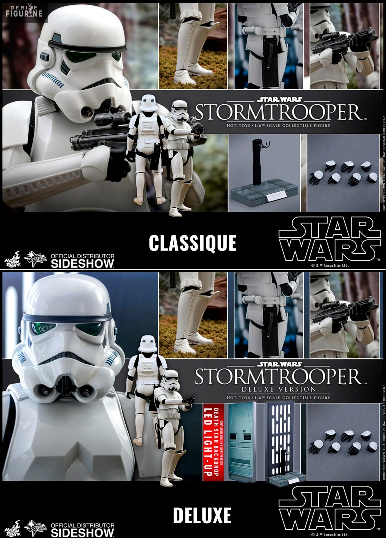 Le Stormtrooper est véritablement culte dans l’univers de Star Wars puisqu’il incarne la première ligne de l’armée des soldats de l’empire et ainsi, celle des Sith. Deux versions sont proposées : La classique propose le simple soldat Stormtrooper avec son lot d’accessoires tandis que la deluxe propose en bonus, un magnifique socle diorama représentant l’un des couloirs de l’étoile de la mort et en plus de cela, ce fameux socle dispose de fonctions d’éclairage pour toujours plus de réalisme.
